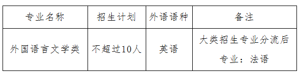 备注:“外国语言文学类”专业为大类招生专业,含商务英语、法语专业。根据《教育部办公厅关于做好2026年普通高等学校部分特殊类型招生工作的通知》(教学厅〔2025〕7号)要求,我校招收的外国语中学推荐保送生均安排在除英语以外的小语种相关专业学习,外语类保送生专业分流时,将自动分流入法语专业学习。